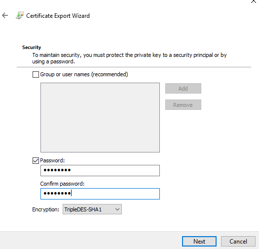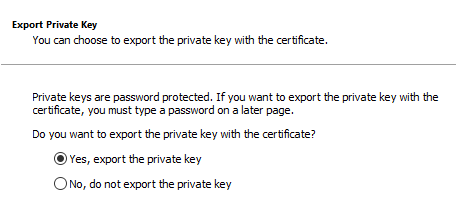 The certificate should be in pfx format. Furthermore, configure a password for the certificate to ensure the private key is exported: