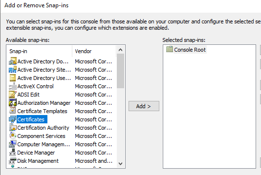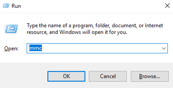 To request a new certificate, we will use the Microsoft Management Console. Load up the console by typing mmc in a run window: