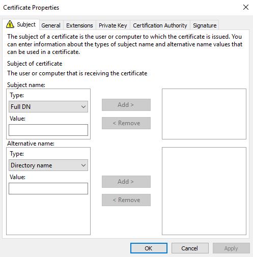 First, we change the Subject name Type to Common Name and provide the name we want for this certificate. Then, we alter the Alternative name Type to User principal name and provide the UPN of the account we want to impersonate. The values should look like this: