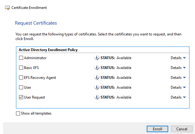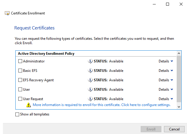 When we click okay, we will now see that we are allowed to enroll this certificate: