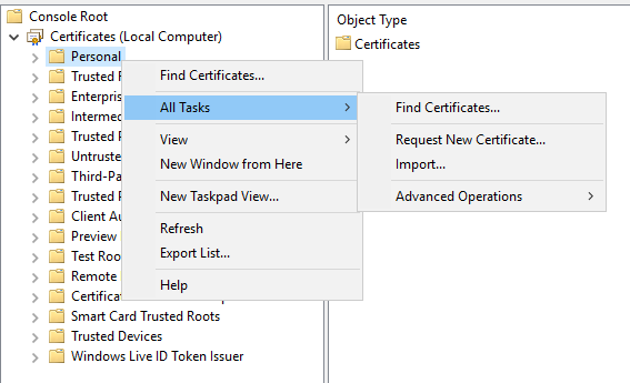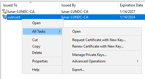 Congratulations, you have just generated a certificate that will provide you with persistent authentication to the domain for the next two years! The last step is to actually export the certificate to get it ready for use. Right-click on the certificate, select All Tasks, and then Export: