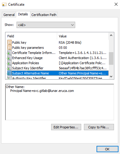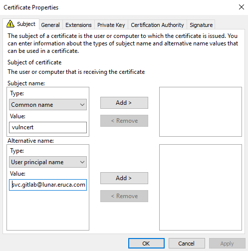 For this example, we will impersonate one of the DA users in this domain. Let's target the svc.gitlab account since it is a service account, meaning Kerberos authentication is likely expected from this account. The UPN of this account is svc.gitlab@lunar.eruca.com. Using this information we can complete the certificate properties.