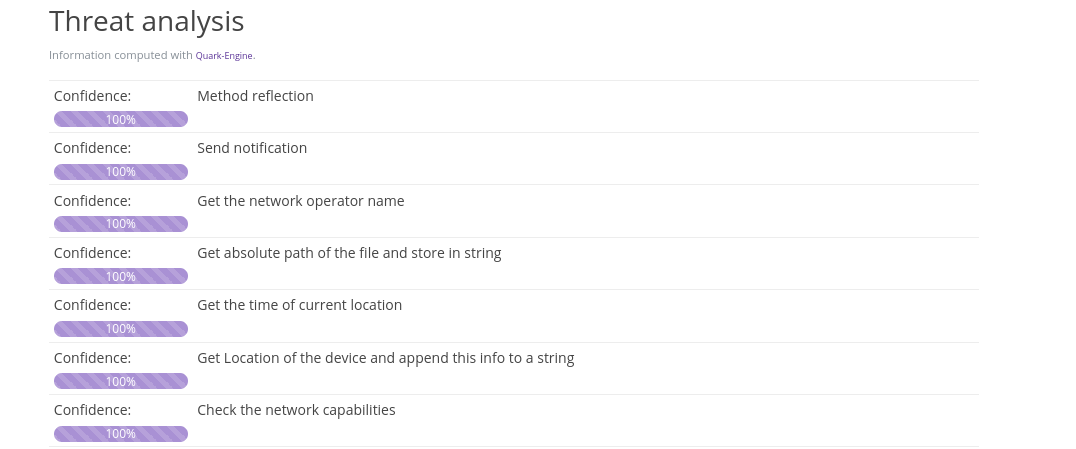 Later on, on the same page on Pithus, we scroll to the Threat Analysis section. The analysis there is based on a tool called Quark. With these tools, it is possible to identify a number of "crimes" (as they call them) to map the behaviour of Android malware.