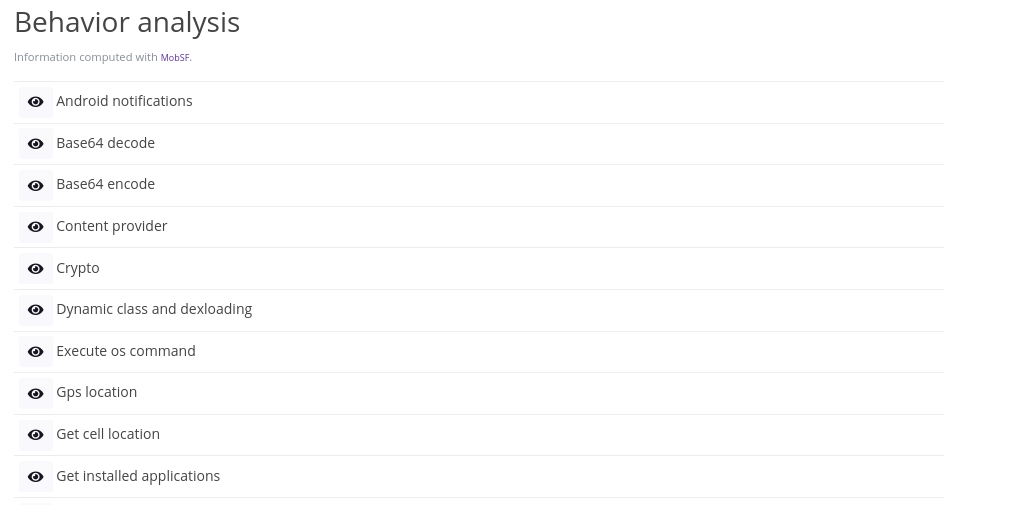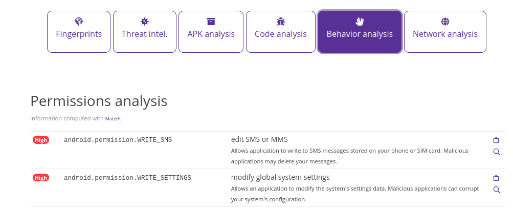 Now moving on to the Behavior Analysis tab, where we will gather some general information on how the APK is behaving. The first part of the tab looks into the permissions that the APK will be requesting. This is a good indicator to identify what kind of resources will be used.