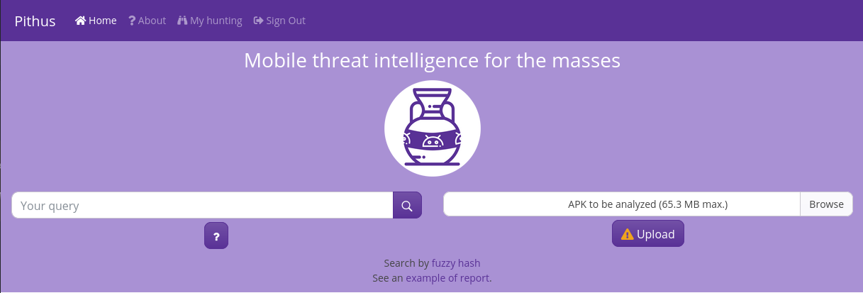 During the next steps, we are going to use Pithus, an open-source, online, static analysis APK tool. Pithus embeds a number of tools you might have seen in previous rooms, such as MoBSF, SSdeep, or APKiD.