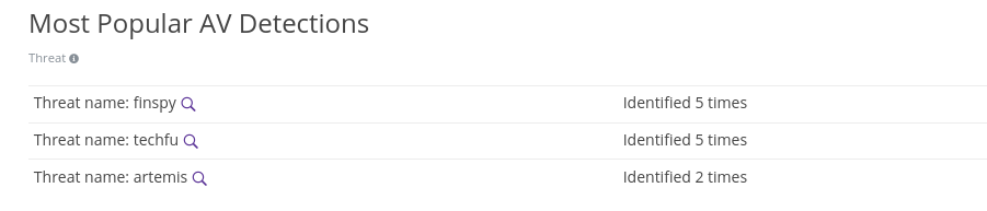 In the Threat Intel tab, scroll down to Most Popular AV Detections. Sometimes, samples are quite unique, and they are not so easily detected. However, Anti-Virus companies might use their knowledge to identify specific patterns in samples. Thanks to this, we can look for samples for a specific name of malware or group.