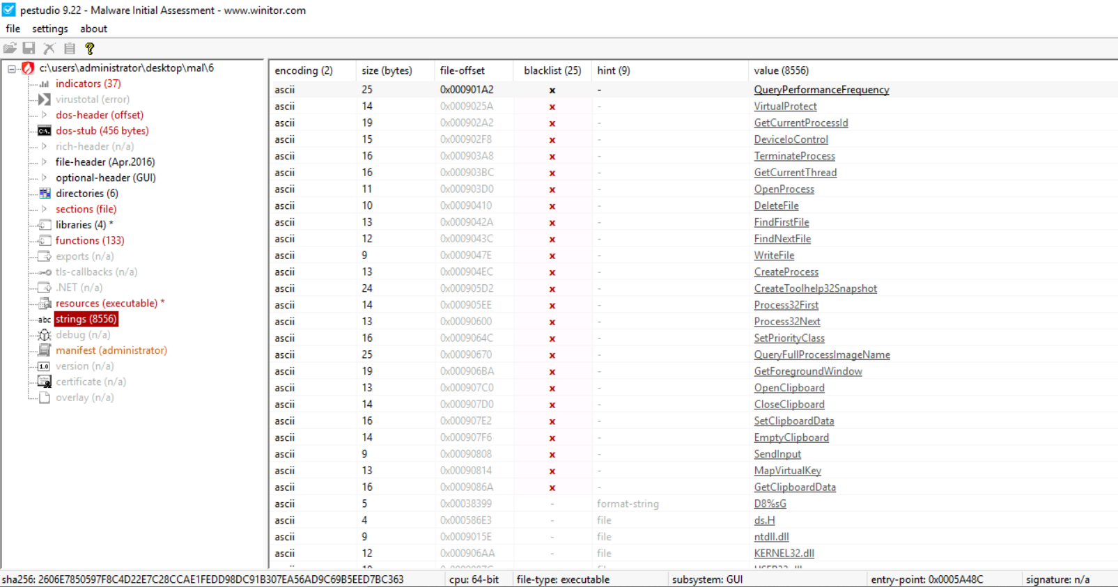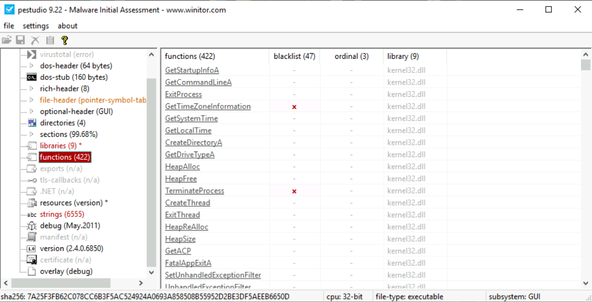 The above screenshot from PEstudio shows strings found by PEstudio in a malware sample. This can be done by selecting strings in the left pane after loading the PE file in PEstudio. The blacklist here shows a bunch of Windows API calls, which PEstudio flags as potentially used in malicious processes. You can learn about these APIs using resources like MalAPI or MSDN.