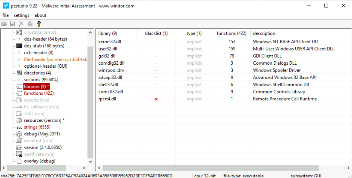 PEStudio has a libraries option in the right pane, which, when selected, shows us the libraries that a PE file will use.