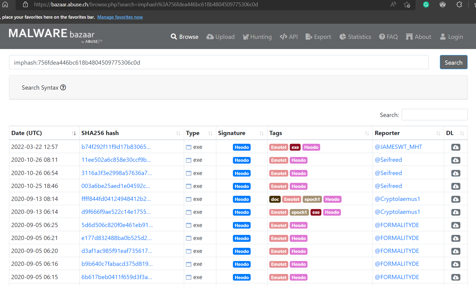 In the above screenshot from Malware Bazaar, all these samples have the same imphash. We can see that all of these samples are classified as the same malware family. We can see that their sha256 hash is vastly different and doesn't provide any information as to their similarity. However, the same imphash helps us identify that they might belong to the same family.
