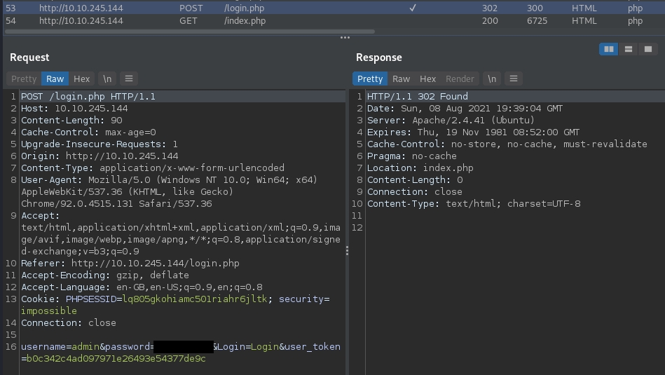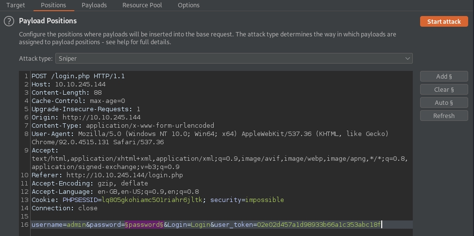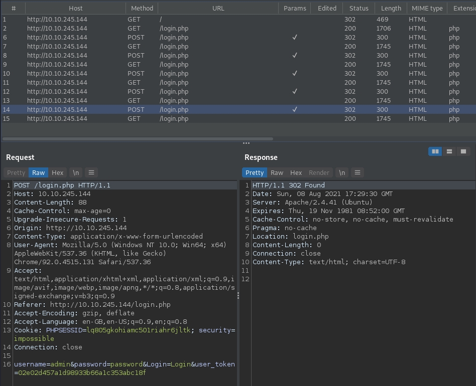 Now those of you who are observant might have noticed that in our screenshot of the successful intruder attack, the response to the correct password attempt had a Response Header called Location, which was set to login.php. Well, one of the other issues with Burp Suite is that it will reuse the same original request. That might work in some instances, but not for all of them. If the server is expecting a unique user_token for each login attempt and it gets the same one reused multiple times, we might not be able to get in even with the correct password. Back to what we said at the start - The format for our request needs to be what the server expects. If it isn't, we're not going to get very far.