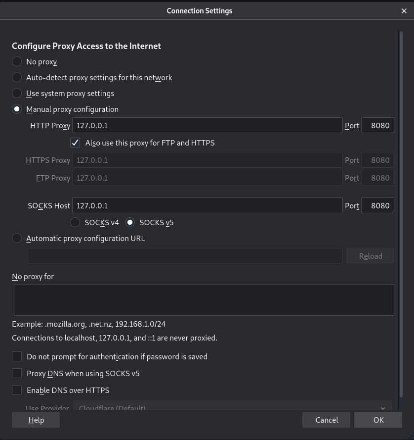 Or set your browser to use Burp Suite as a proxy - Port Swigger (the people behind Burp Suite) have a great guide here, so if you're unsure, follow that. Whichever browser you're using your proxy settings will need to look something like this: