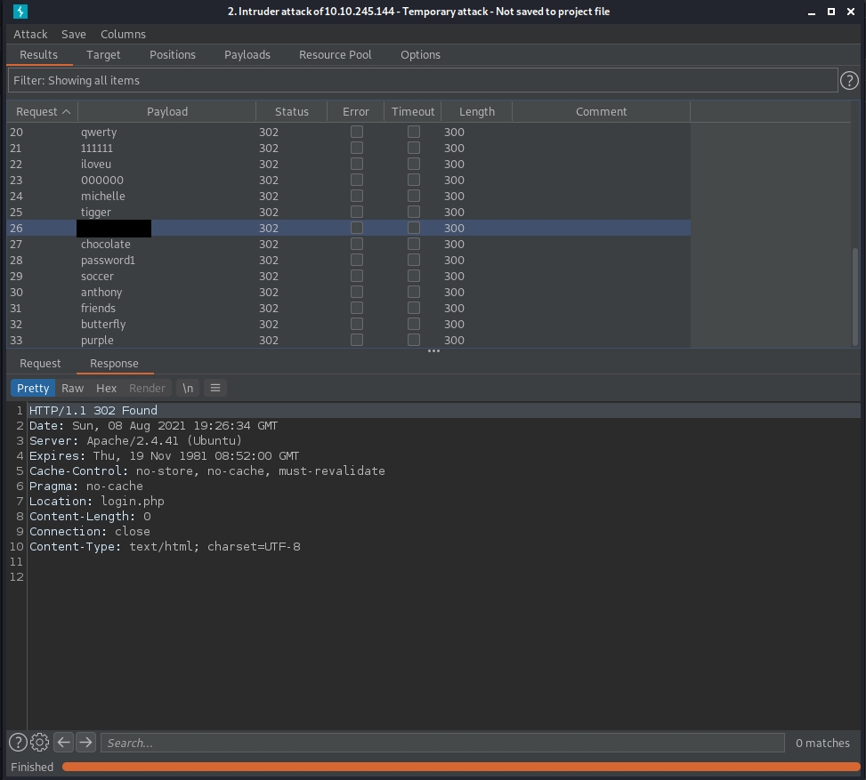 Now. This is where I have a confession to make. The screenshot below shows me trying to brute force the login. The value I have covered over is the correct password. Notice anything strange about the successful password?