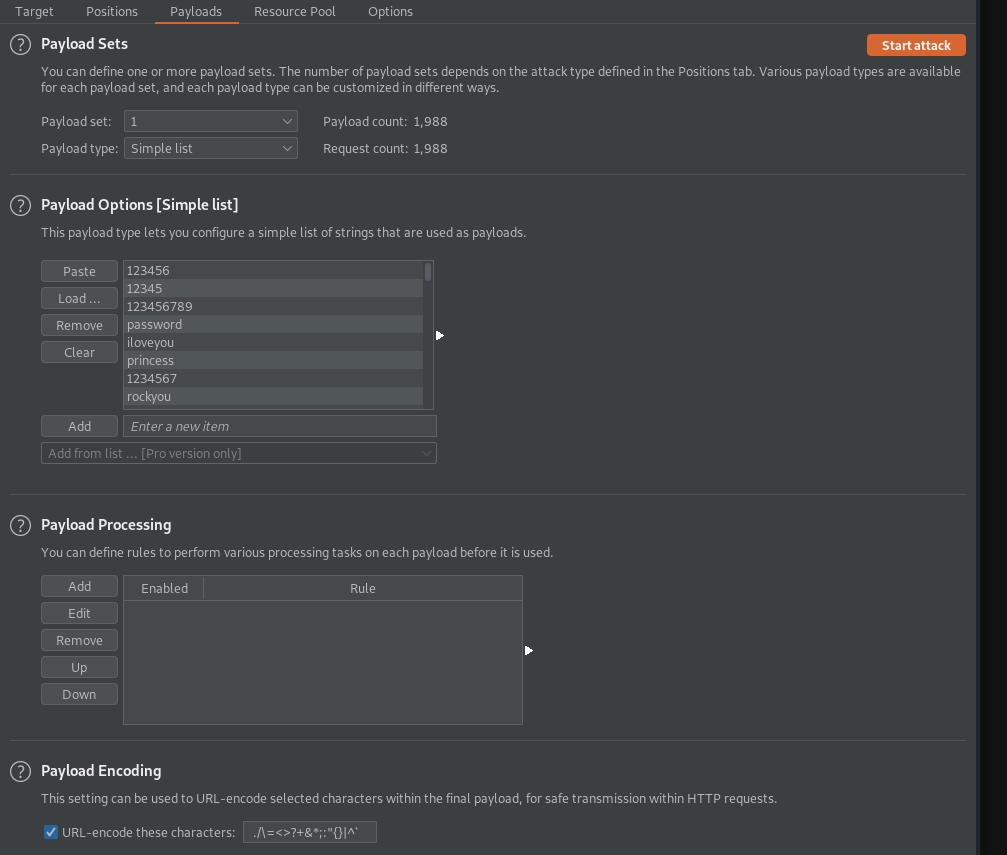 The Intruder->Payloads tab is where we add the payload to be used in the replacement. Burp Suite will take the payload we provide and use its values to replace our marked value. There are a few options here for loading payloads. We are going to load the password file provided in this room by clicking Load ... within the Payload Options [Simple List] section. Select the passwords.txt file you downloaded, and you should see the contents are loaded in, which should look like the below: