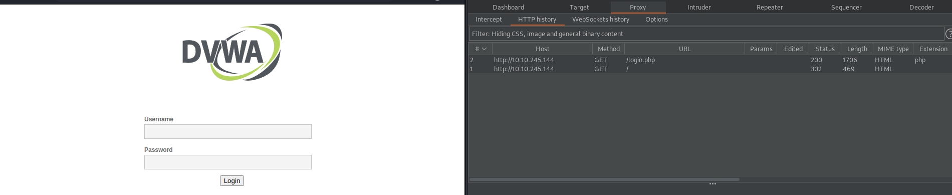 Once Burp Suite is up and running, go ahead and access the DVWA instance by pointing your web browser at http://MACHINE_IP. You should be met with a login screen. I recommend turning off the intercept (it's under the Proxy->Intercept tab and can be seen in the first screenshot above). We don't really need it for this task, and it is going to get really annoying if you have to manually forward each and every request. Instead, we'll be able to do everything we want from the HTTP history tab. So your screen should look like this: