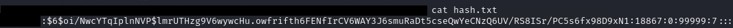 Hash.Mode........: 1800 (sha512crypt $6$, SHA512 (Unix))
