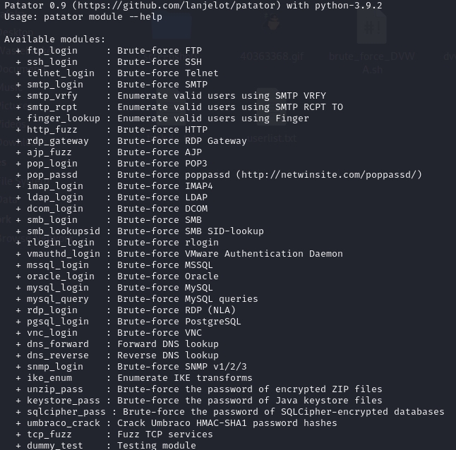 So first thing first - Let's look at Patator a bit before we get started. If you run patator -h, you'll get the following output listing the available modules (remember to run the command we gave you in the Introduction section in order to allow Patator to run correctly on the AttackBox):