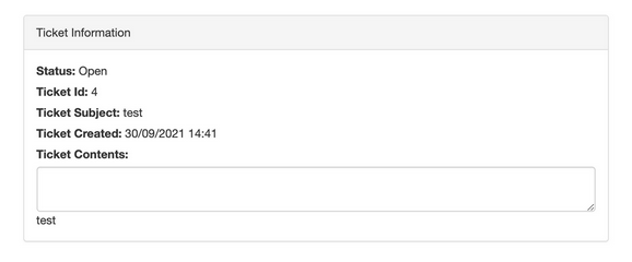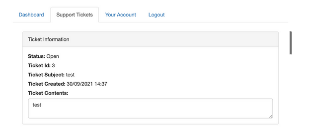 Try creating a support ticket by clicking the green Create Ticket button, enter the subject and content of just the word test and then click the blue Create Ticket button. You'll now notice your new ticket in the list with an id number which you can click to take you to your newly created ticket.