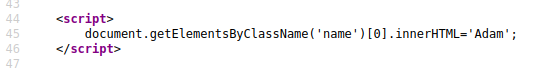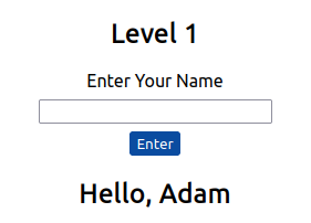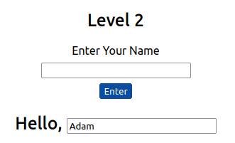 Entering your name into the form, you'll see it reflected on the page. This level looks similar to level one, but upon inspecting the page source, you'll see your name gets reflected in some JavaScript code.