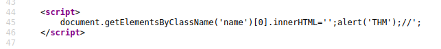 You'll have to escape the existing JavaScript command, so you're able to run your code; you can do this with the following payload ';alert('THM');// which you'll see from the below screenshot will execute your code. The ' closes the field specifying the name, then ; signifies the end of the current command, and the // at the end makes anything after it a comment rather than executable code.