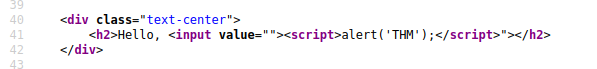 Similar to level two, where we had to escape from the value attribute of an input tag, we can try ">alert('THM'); , but that doesn't seem to work. Let's inspect the page source to see why that doesn't work.