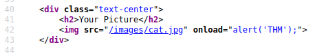 Let's change our payload to reflect this /images/cat.jpg" onload="alert('THM'); and then viewing the page source, and you'll see how this will work.