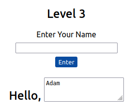 Like the previous level, you're being asked again to enter your name. This time when clicking enter, your name is being reflected in an input tag instead: