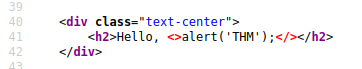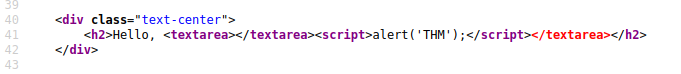 We'll have to escape the textarea tag a little differently from the input one (in Level Two) by using the following payload: alert('THM'); This turns this: