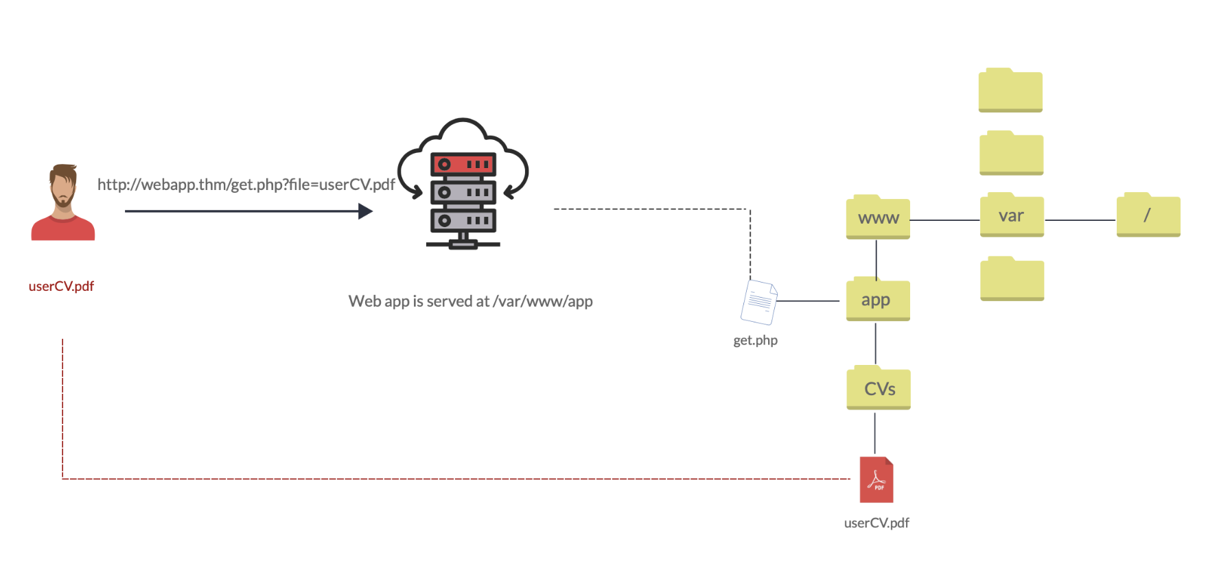 Let's discuss a scenario where a user requests to access files from a webserver. First, the user sends an HTTP request to the webserver that includes a file to display. For example, if a user wants to access and display their CV within the web application, the request may look as follows, http://webapp.thm/get.php?file=userCV.pdf, where the file is the parameter and the userCV.pdf, is the required file to access.