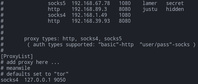 To begin working with the session, we need to configure our proxy settings to tunnel through the SOCKs session created by NTLMRelayX. Add the following line to your proxychains configuration: