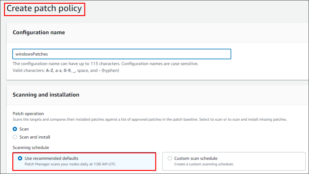 We will enter the configuration name and select options like scan or scan and install patches immediately. In the next section, we must enter all the necessary details for patching.