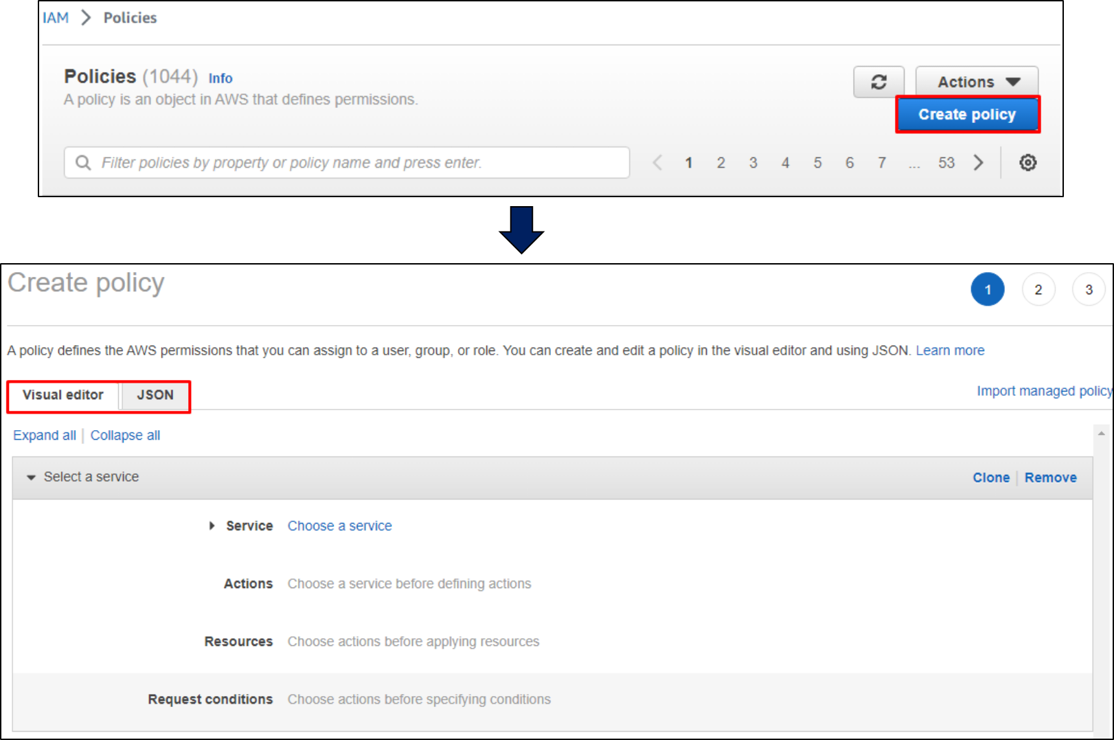 IAMin the services menu and click onOpen Policies.Click on Create Policy - AWS IAM provides two approaches to create a policy, i.e. via JSON & Visual Editor.