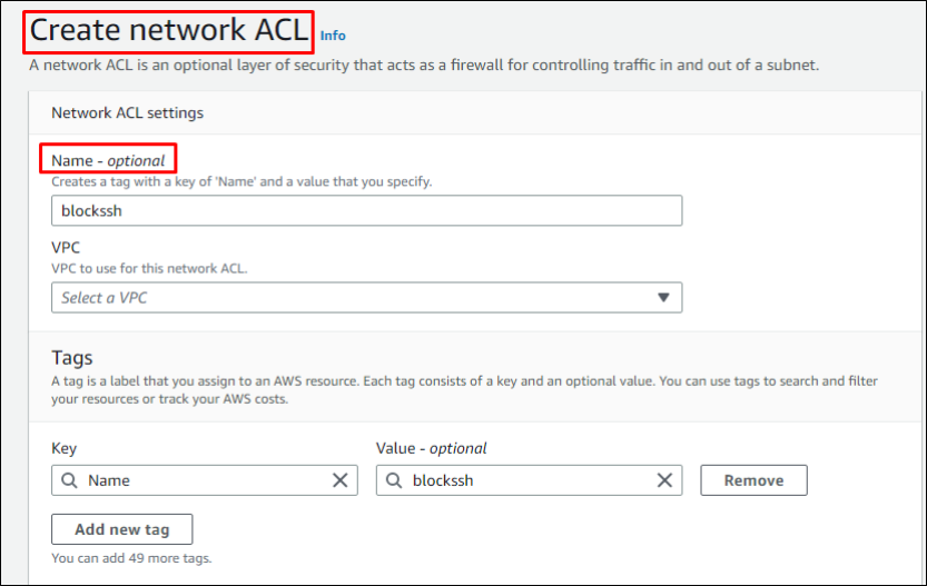 Enter basic settings such as name, VPC and tags (optional) and click create network ACL