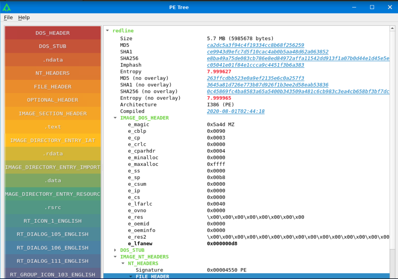 Check out the GUI-based Petree tool and see what information it shows. You can use the following command for using the pe-tree tool to analyze the 'redline' malware. (The pe-tree tool might take some time to initiate.)