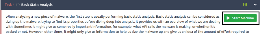 When malware is analyzed without being executed, it is called Static Analysis. In this case, the different properties of the PE file are analyzed without running it. Similarly, in the case of a malicious document, exploring the document's properties without analyzing it will be considered Static Analysis. Examples of static analysis include checking for strings in malware, checking the PE header for information related to different sections, or looking at the code using a disassemble. We will look at some of these techniques later in the room.