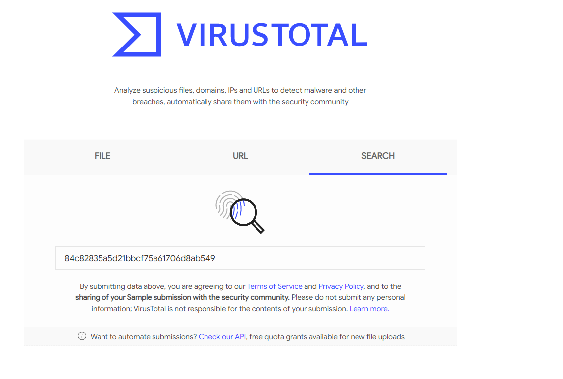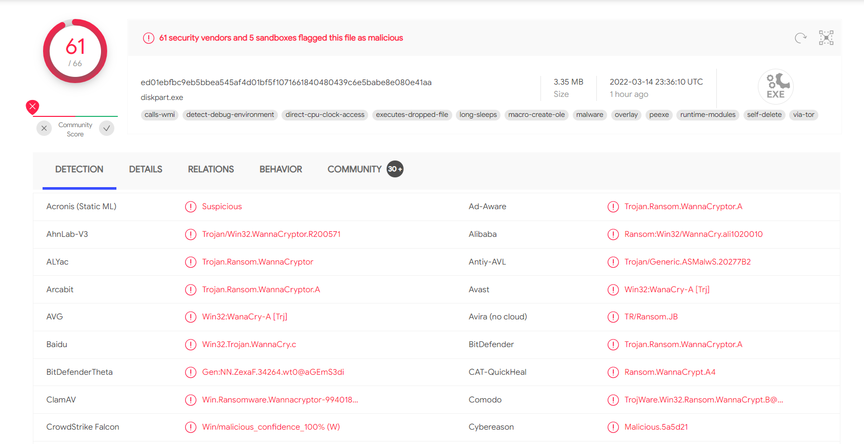 Let's see what it says about the sample we calculated the hash for above. We can search for the md5sum we calculated for the wannacry sample on the VirusTotal homepage: