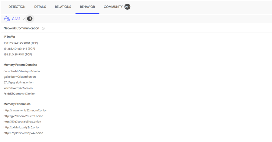 This part provides us with a lot of information about the behavior of the sample when it was run in a sandbox. We can click each process to find more detail about it. In the above screenshot, of particular interest can be the executions of cmd.exe. We can see that the sample is running script files and deleting backups and volume shadow copies, something often done by ransomware operators to stop the victim from restoring their files from these sources.