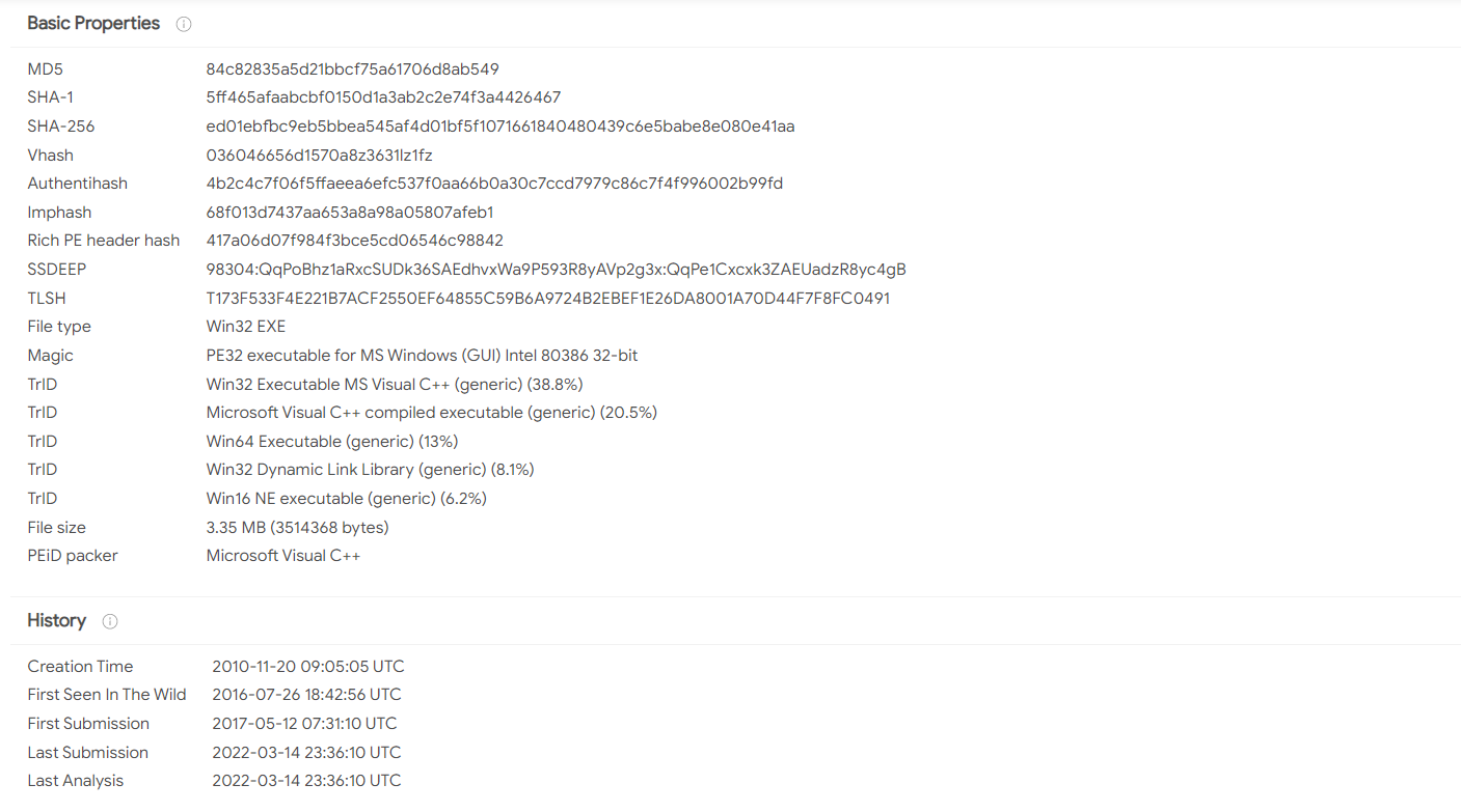 Scanning a file using AVs or searching for a hash on VirusTotal can also provide useful information about the classification of malware performed by security researchers. However, when using an online scanner, it is recommended to search for the malware's hash instead of uploading online to avoid leaking sensitive information online. Only upload a sample if you are sure of what you are doing.