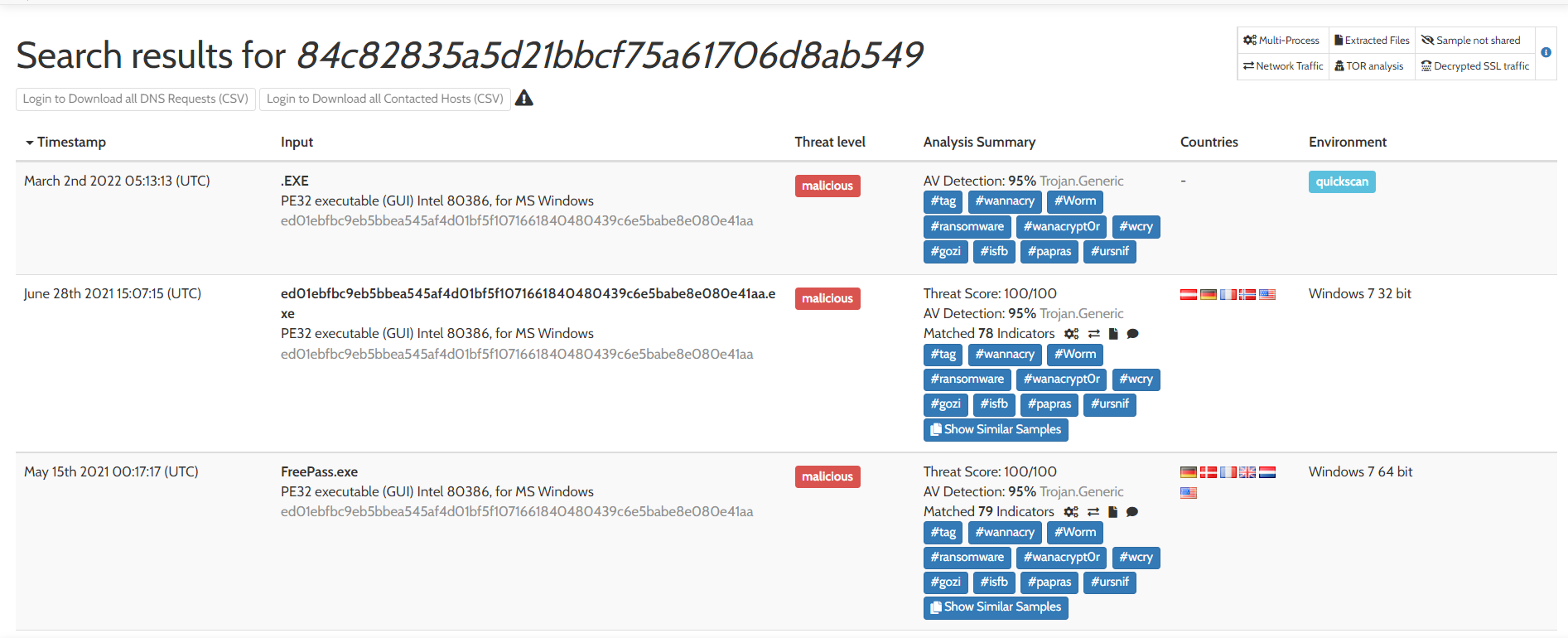 As we mentioned, we will not be submitting a sample. Instead, we will search for the hash of our sample. Therefore, we will search for the md5sum of the wannacry sample from the attached VM. We will see that it is already submitted multiple times, and we can choose from the submitted results.
