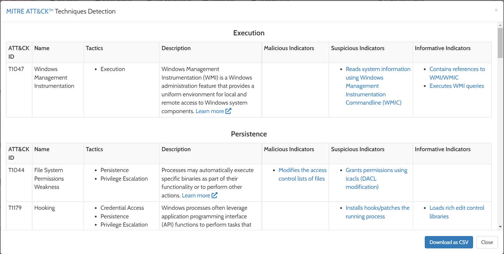 We will see the above interface when we click on the sample. We can see a navigation pane on the right that highlights different parts of the report. We can also see that the verdict is malicious, with a threat score of 100/100 and AV detection of 95%. Below that, we see the overview of the sample's behavior. Below that, we will see the mapping to MITRE ATT&CK techniques. We will see the following mapping when we click view all details: