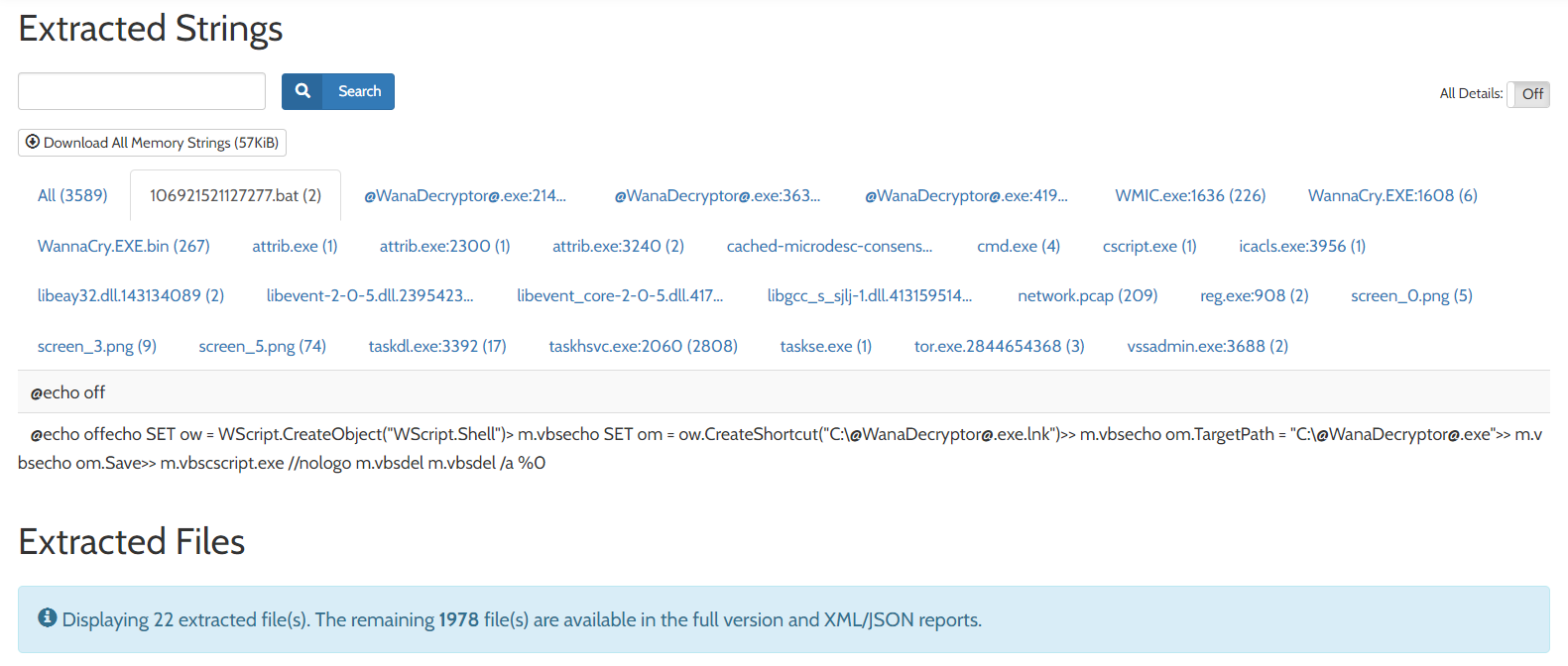 Extracted strings and extracted files are also available in the report. These can provide information about the batch scripts we saw in the processes above.