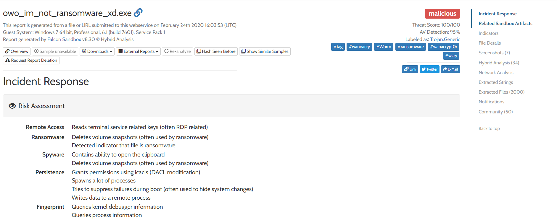 Below that, we will see some indicators and context information and some static analysis information for the sample. The dynamic analysis part comes below that: