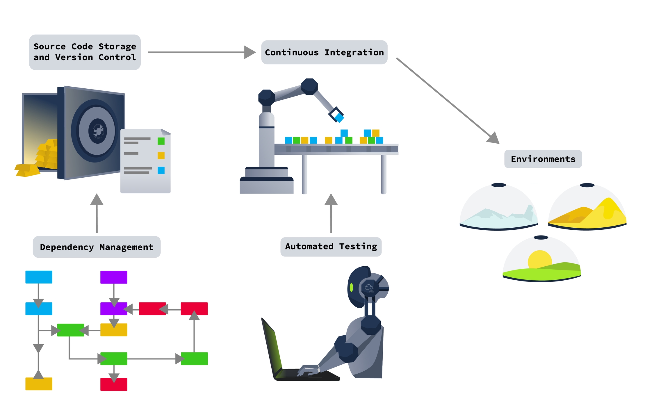 Let's talk about dependencies. Although we might think that we are writing a large amount of code when we develop, the truth is that it is only the tip of the iceberg. Unless you are coding in binary, chances are you are actually only writing a fraction of the actual code. This is because a lot of the code has already been written for us in the form of libraries and software development kits (SDKs). Even variables like String in an application have an entire library behind them! The management of these dependencies is a vital part of the pipeline.