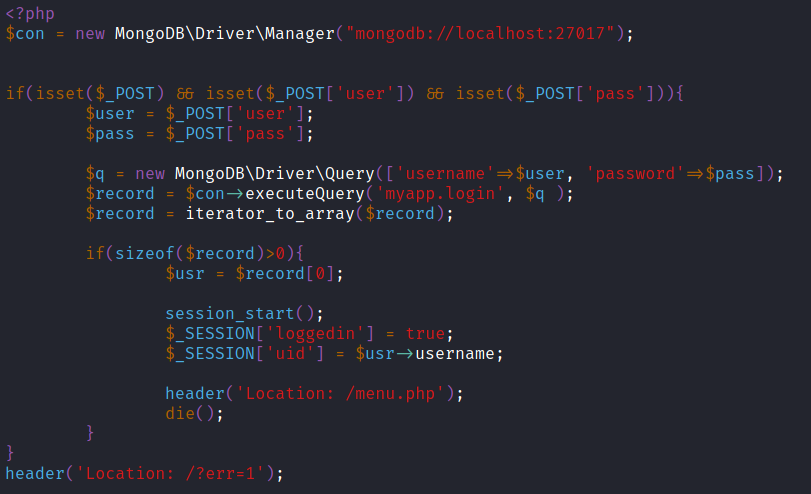 The web application is making a query to MongoDB, using the "myapp" database and "login" collection, requesting any document that passes the filter **['username'=>$user, 'password'=>$pass]**, where both $user and $pass are obtained directly from HTTP POST parameters