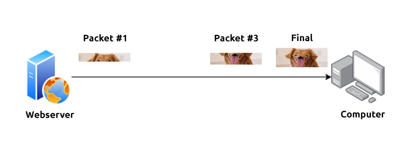 In the diagram below, we can see how a picture of a dog is broken down into small pieces of data (known as packets) from the "webserver", where the "computer" re-constructs the picture of the dog into the correct order.