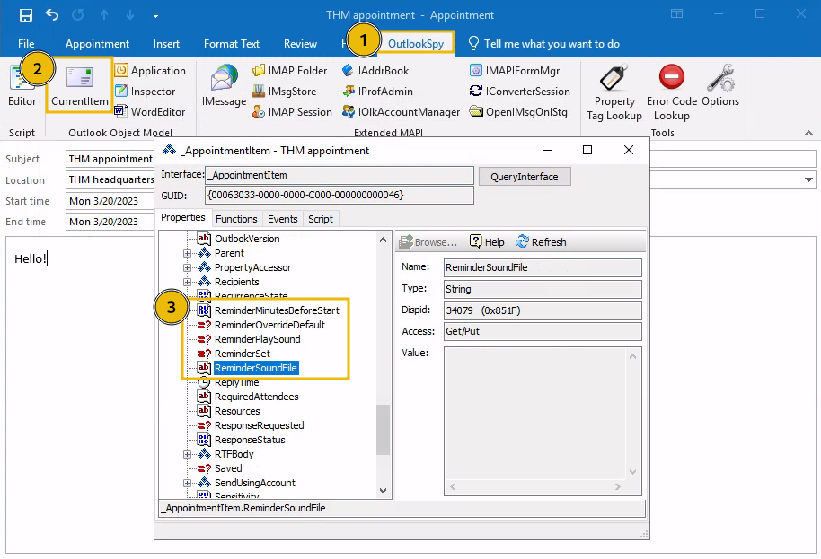 From this window, you can see the parameters associated with the appointment's reminder. We want to set the ReminderSoundFile parameter to the UNC path that points to our AttackBox and set both the ReminderOverrideDefault and ReminderPlaySound to true. Just for reference, here's what each parameter does:
