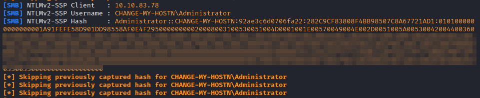 And you should receive the authentication attempt in your Responder console on your AttackBox: