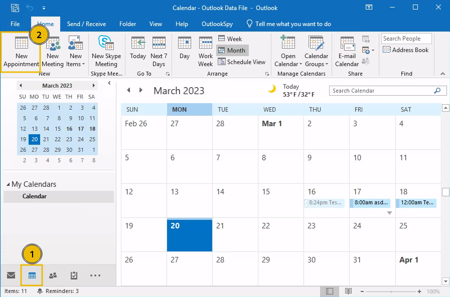 As a first attempt, we could manually create an appointment and edit the path to the reminder's sound file to point to a shared folder. To create an appointment, you will first need to click on the calendar and then on the New Appointment button on the taskbar, as shown in the image below: